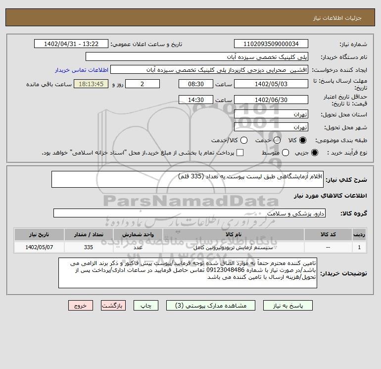 شرح کلی نیاز: اقلام آزمایشگاهی طبق لیست پیوست به تعداد (335 قلم)