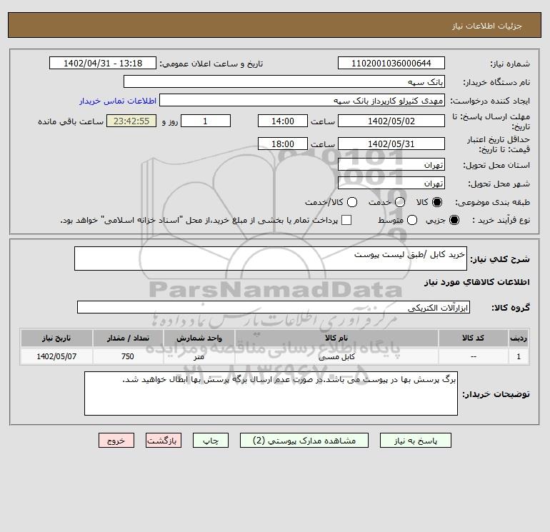 شرح کلی نیاز: خرید کابل /طبق لیست پیوست