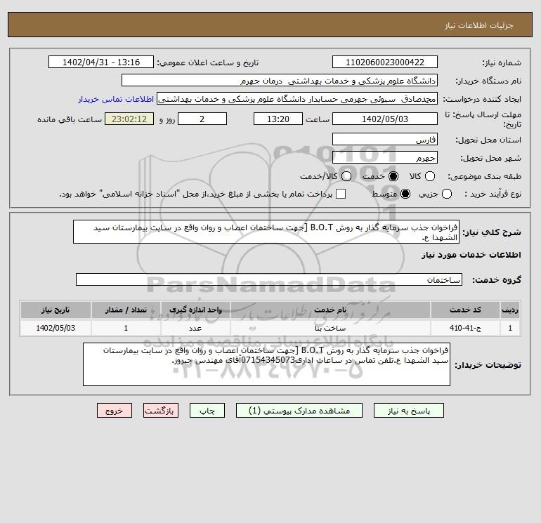 توضیحات خریدار:فراخوان جذب سرمایه گذار به روش B.O.T [جهت ساختمان اعصاب و روان واقع در سایت بیمارستان سید الشهدا ع.تلفن تماس در ساعات اداری07154345073آقای مهندس جبروز.