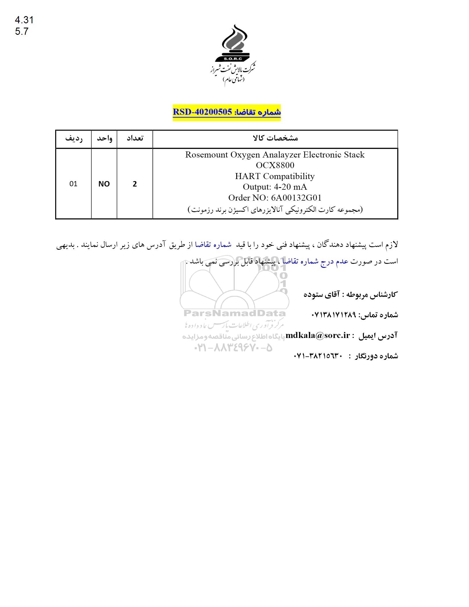 استعلام بها و موضوع استعلام استعلام ROSEMOUNT OXYGEN ANALAYZER..... به اطلاع کلیه شرکتها و افراد متخصص واجد شرایط میرساند، آگهی گذار در نظر دارد از طریق استعلام بها، نسبت به انتخاب و دریافت پیشنهادات اقدام نماید. این استعلام با کد آگهی ثبت شده در سامانه خبرگزاری پارس نماد : 6121782 منتشر شده است. مشخصات استعلام : تاریخ شروع استعلام: 1402/04/31 آخرین مهلت ارسال پیشنهاد قیمت : 1402/05/07 و محل اجرای پروژه : استان فارس میباشد. استعلام قیمت مورد درخواست : استعلام ROSEMOUNT OXYGEN ANALAYZER..... با دستهبندیهای تخصصی و گروه های مرتبط : ابزار دقیق, خدمات و تجهیزات آزمایشگاهی و پزشکی, گازهای طبی و صنعتی و مخازن و تجهیزات مربوطه, تجهیزات نفت و گاز, استعلام اطلاع رسانی میگردد.