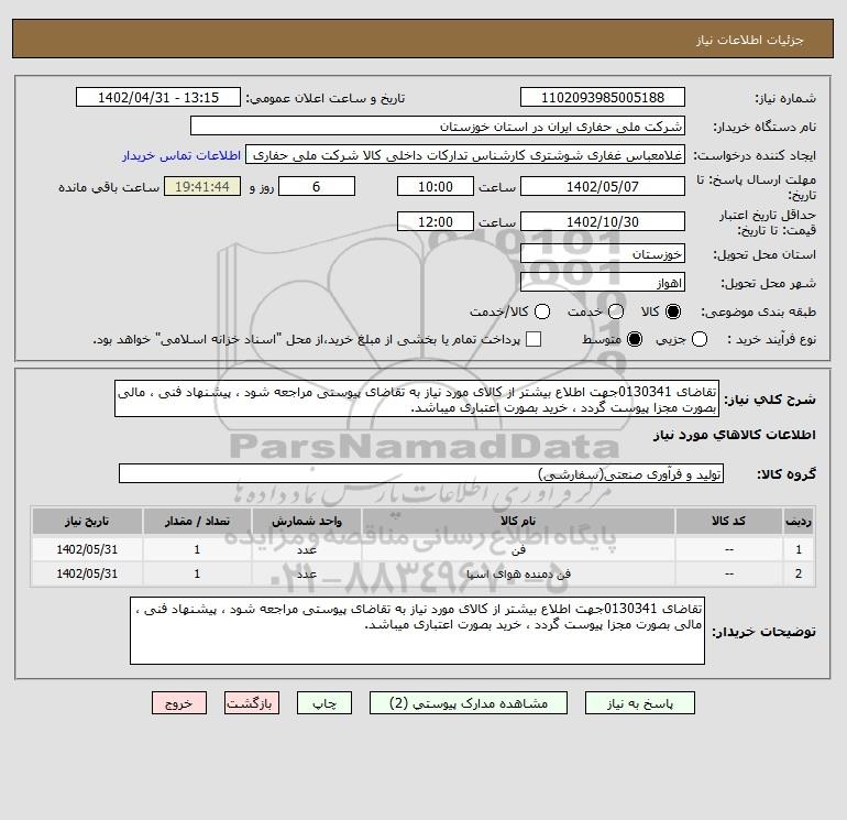 توضیحات خریدار:تقاضای 0130341جهت اطلاع بیشتر از کالای مورد نیاز به تقاضای پیوستی مراجعه شود ، پیشنهاد فنی ، مالی بصورت مجزا پیوست گردد ، خرید بصورت اعتباری میباشد.