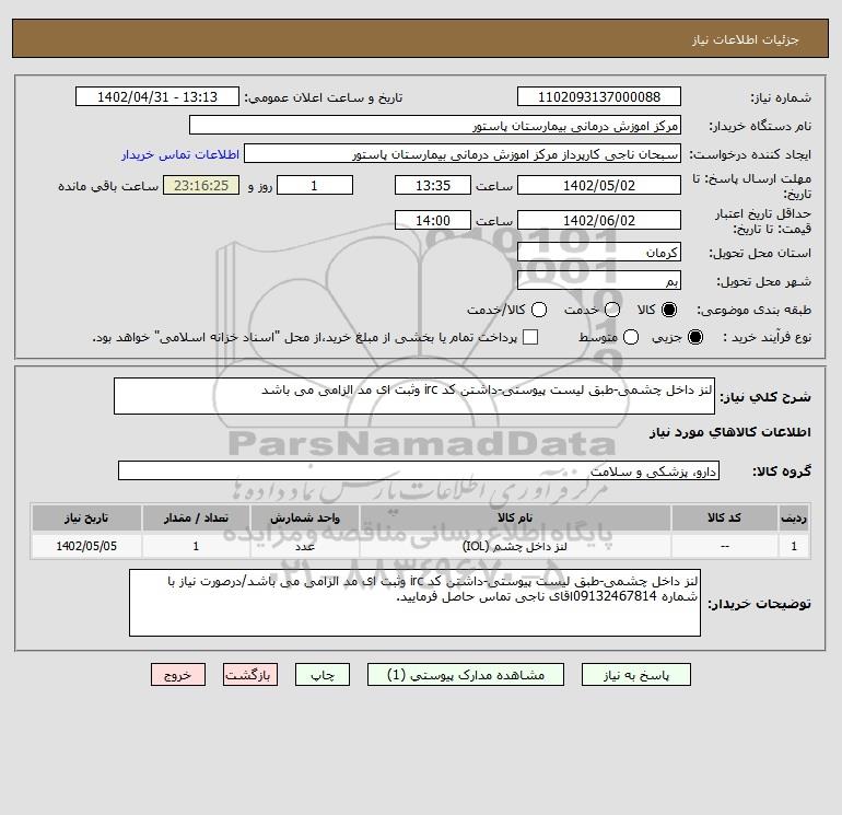 | 1 | -- | لنز داخل چشم (IOL) | عدد | 1 | 1402/05/05 |