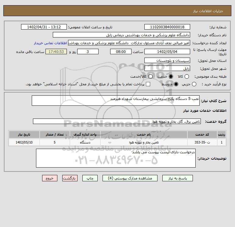 شرح کلی نیاز: نصب 5 دستگاه پکیج سرمایشی بیمارستان شهداء هیرمند