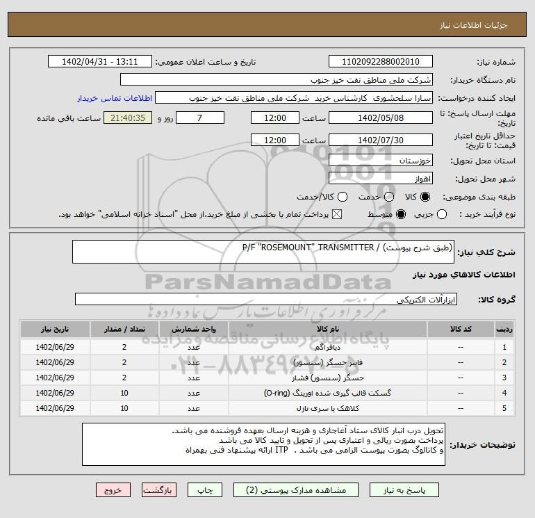 شرح کلی نیاز: (طبق شرح پیوست) / P/F "ROSEMOUNT" TRANSMITTER