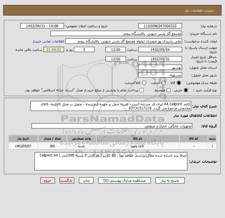 شرح کلی نیاز: کاغذ A4 Cellprint ایران کد مشابه است - هزینه حمل بر عهده فروشنده - تحویل در محل کارفرما- کالای مخدوش مرجوع می گردد. 07731317119