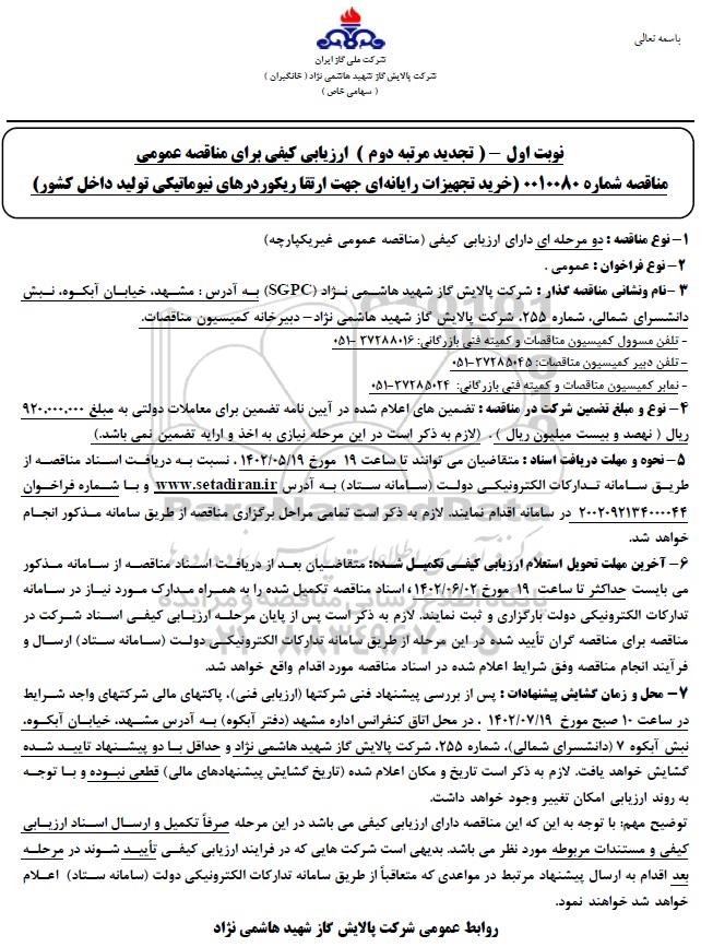 تجدید مرتبه دوم خرید تجهیزات رایانه ای جهت ارتقا ریکوردرهای نیوماتیکی تولید داخل کشور