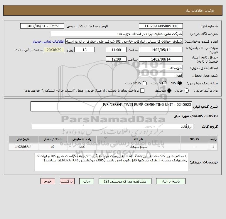 شرح کلی نیاز: P/F:"JEREH" TWIN PUMP CEMENTING UNIT - 0245023