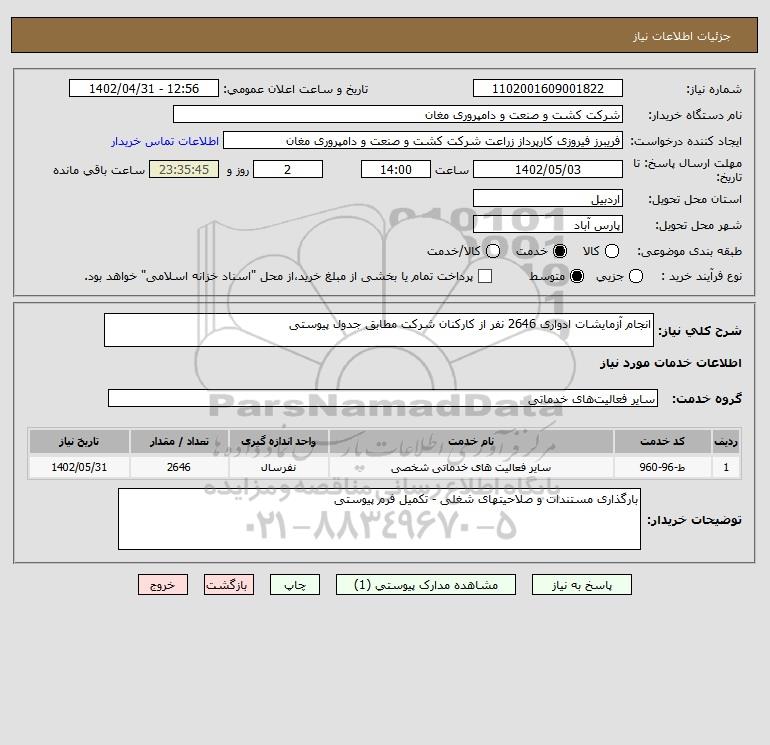 شرح کلی نیاز: انجام آزمایشات ادواری 2646 نفر از کارکنان شرکت مطابق جدول پیوستی