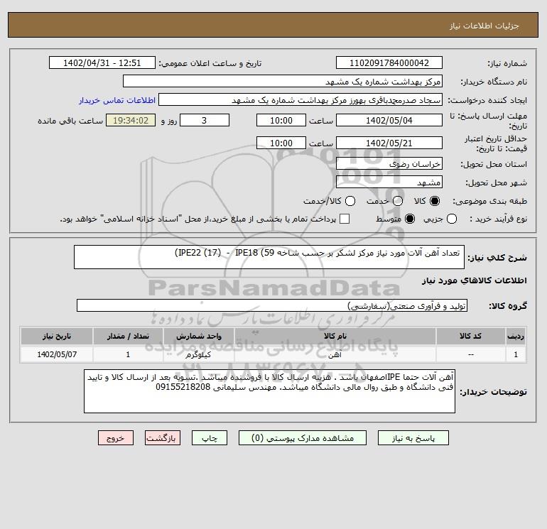 شرح کلی نیاز: تعداد آهن آلات مورد نیاز مرکز لشکر بر حسب شاخه IPE22 (17) - IPE18 (59)