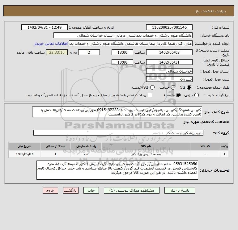 نام دستگاه خریدار:دانشگاه علوم پزشکی و خدمات بهداشتی درمانی استان خراسان شمالی
