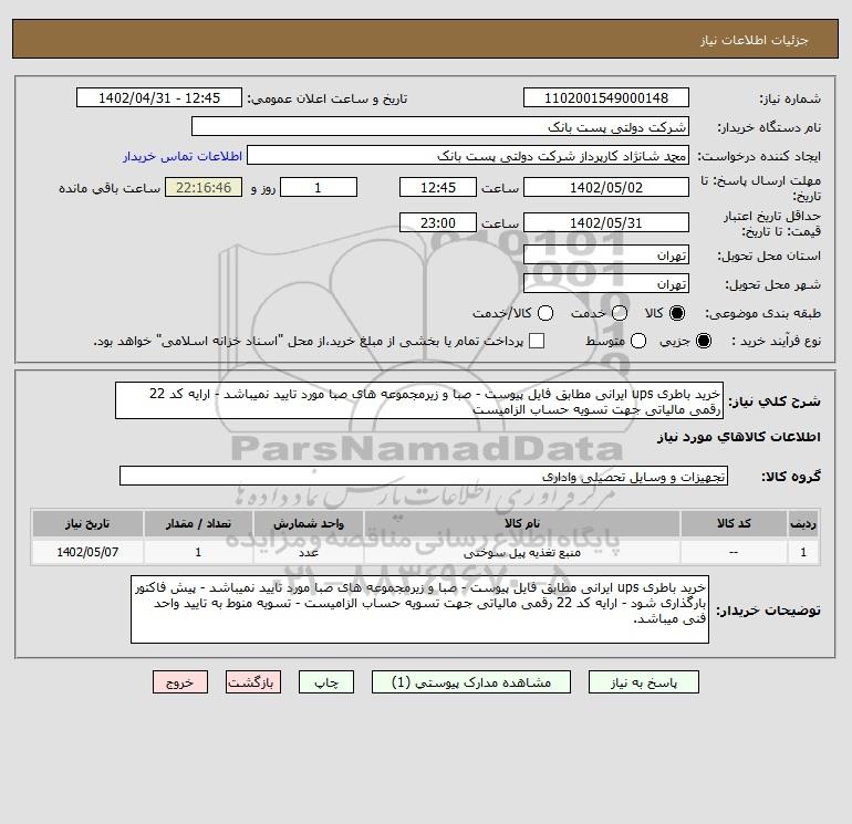 شرح کلی نیاز: خرید باطری ups ایرانی مطابق فایل پیوست - صبا و زیرمجموعه های صبا مورد تایید نمیباشد - ارایه کد 22 رقمی مالیاتی جهت تسویه حساب الزامیست