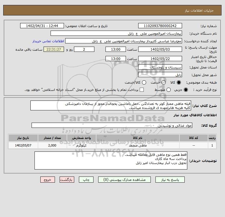 توضیحات خریدار:فقط همین نوع ماهی قابل معامله میباشد. پرداخت سه ماه کاری تحویل درب انبار بیمارستان امیر زابل