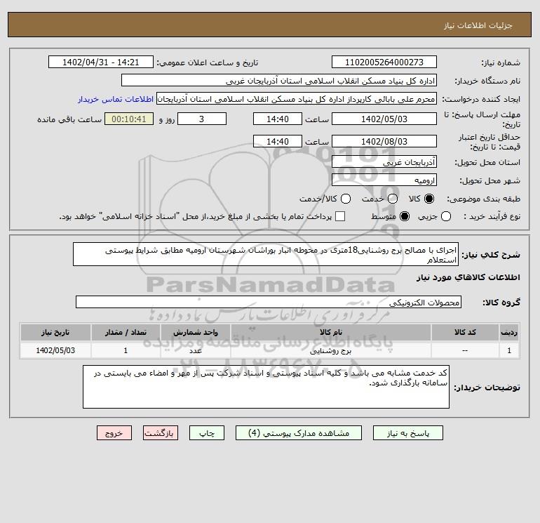 شرح کلی نیاز: اجرای با مصالح برج روشنایی18متری در محوطه انبار بوراشان شهرستان ارومیه مطابق شرایط پیوستی استعلام