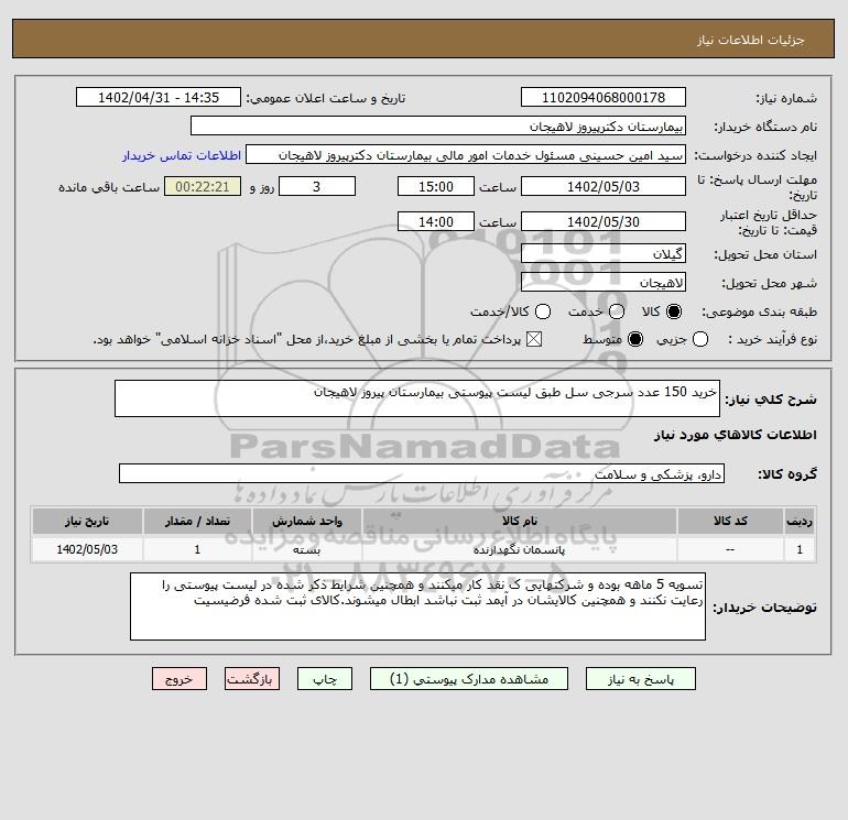 شرح کلی نیاز: خرید 150 عدد سرجی سل طبق لیست پیوستی بیمارستان پیروز لاهیجان