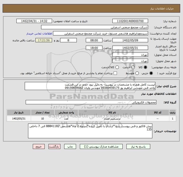 | 1 | -- | ترنسمیتر فشار | عدد | 10 | 1402/05/31 |