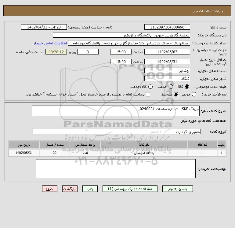 شرح کلی نیاز: بیرینگ SKF - شماره تقاضای 0240031