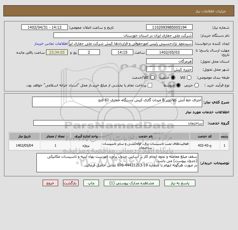 شرح کلی نیاز: اجرای خط آتش کلاستر B میدان گازی کیش دستگاه حفاری 61 فتح