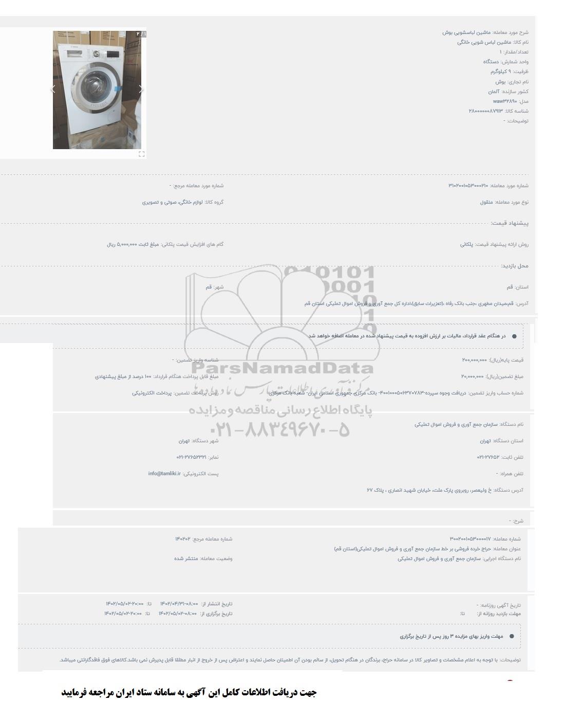 مزایده عمومی مزایده ماشین لباسشویی بوش برگزار میگردد. از کلیه افراد متخصص و شرکتهای واجد شرایط دعوت به عمل میآید تا در این مزایده با کد خبرگزاری پارس نماد : 6122079 شرکت نمایند تاریخ شروع مزایده : 1402/04/31 مهلت شرکت در مزایده: تا پایان روز 1402/05/02 مکان برگزاری اموال واگذاری استانهای قم و دستهبندیهای مربوط به این حراجی متفرقه میباشد.