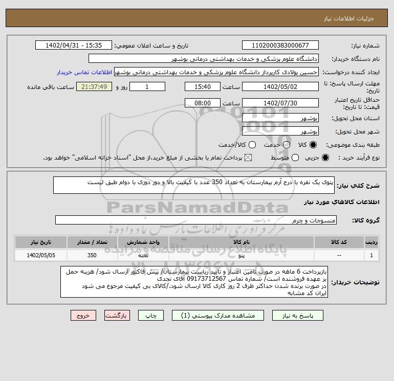 شرح کلی نیاز: پتوی یک نفره با درج آرم بیمارستان به تعداد 350 عدد با کیفیت بالا و دور دوزی با دوام طبق لیست