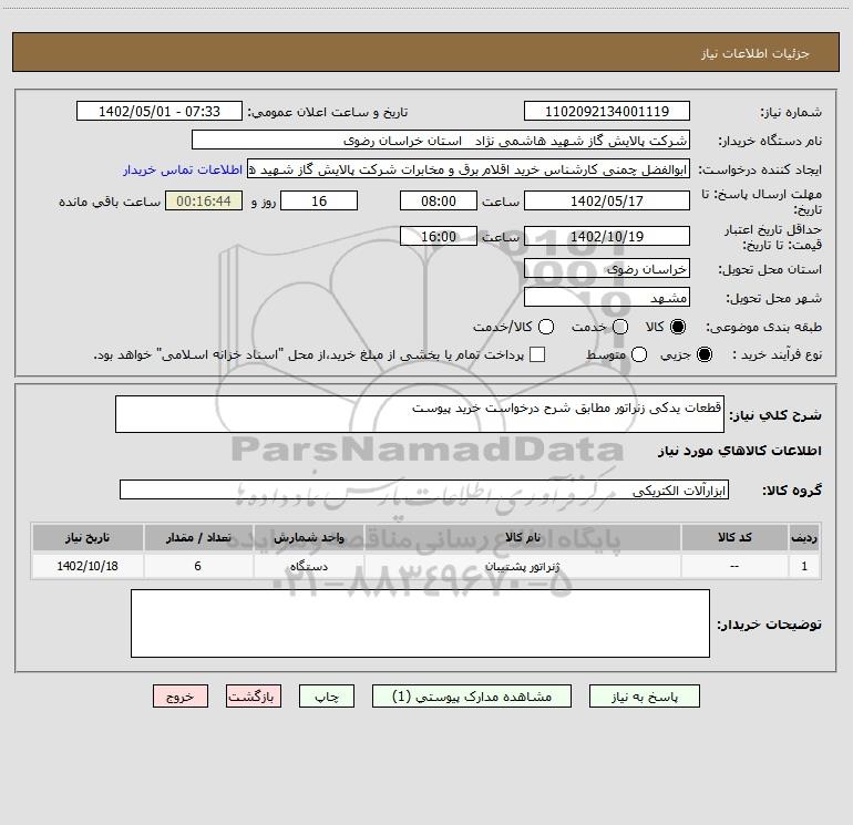 نام دستگاه خریدار:شرکت پالایش گاز شهید هاشمی نژاد استان خراسان رضوی