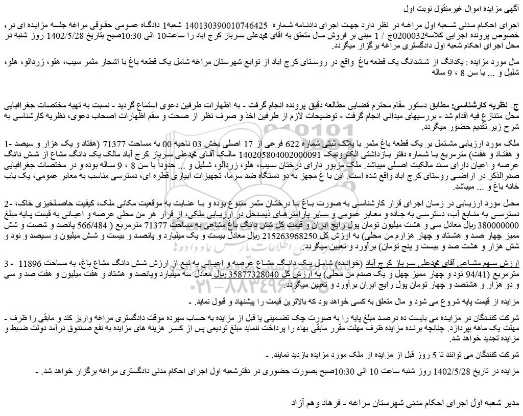 مال مورد مزایده : یکدانگ از ششدانگ یک قطعه باغ واقع در روستای کرج آباد از توابع شهرستان مراغه شامل یک قطعه باغ با اشجار مثمر سیب، هلو، زردآلو، هلو، شلیل و ... با سن 8 ، 9 ساله