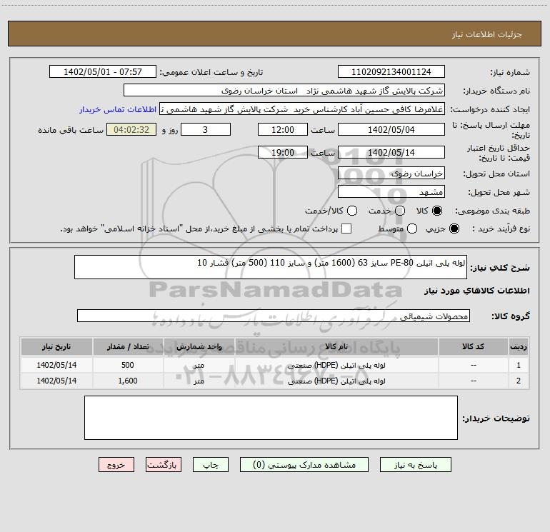 شرح کلی نیاز: لوله پلی اتیلن PE-80 سایز 63 (1600 متر) و سایز 110 (500 متر) فشار 10