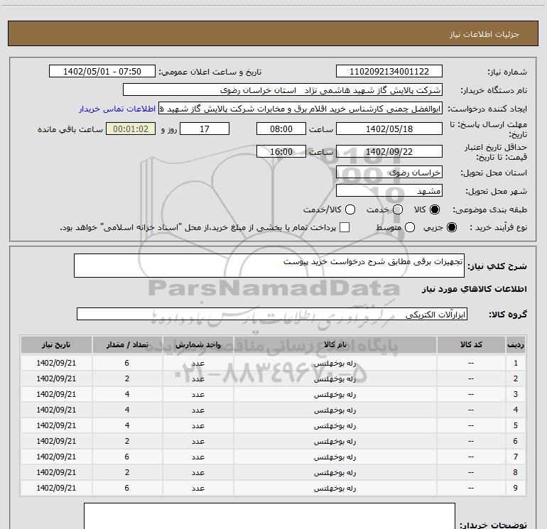 نام دستگاه خریدار:شرکت پالایش گاز شهید هاشمی نژاد استان خراسان رضوی