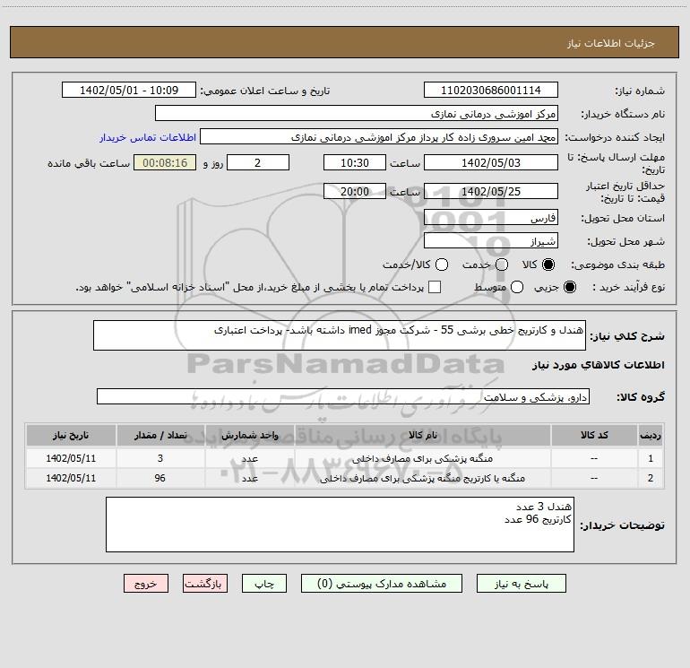 شرح کلی نیاز: هندل و کارتریج خطی برشی 55 - شرکت مجوز imed داشته باشد- پرداخت اعتباری