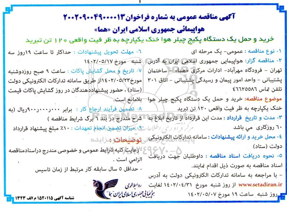 علاقهمندان میتوانند جهت دریافت اسناد و اطلاعات تکمیلی، مناقصه خرید و حمل یک دستگاه پکیج چیلر هوا خنک یکپارچه با سامانه مناقصات و مزایدات ایران پارسنماد داده ها 88349670 تماس حاصل نمایند.