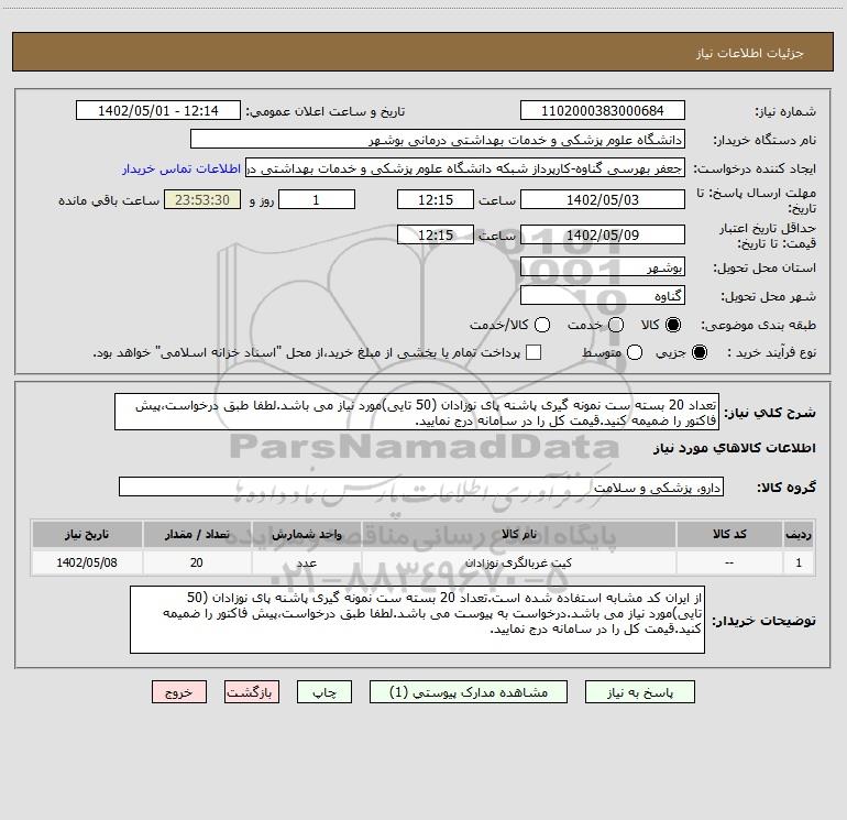 توضیحات خریدار:از ایران کد مشابه استفاده شده است.تعداد 20 بسته ست نمونه گیری پاشنه پای نوزادان (50 تایی)مورد نیاز می باشد.درخواست به پیوست می باشد.لطفا طبق درخواست،پیش فاکتور را ضمیمه کنید.قیمت کل را در سامانه درج نمایید.