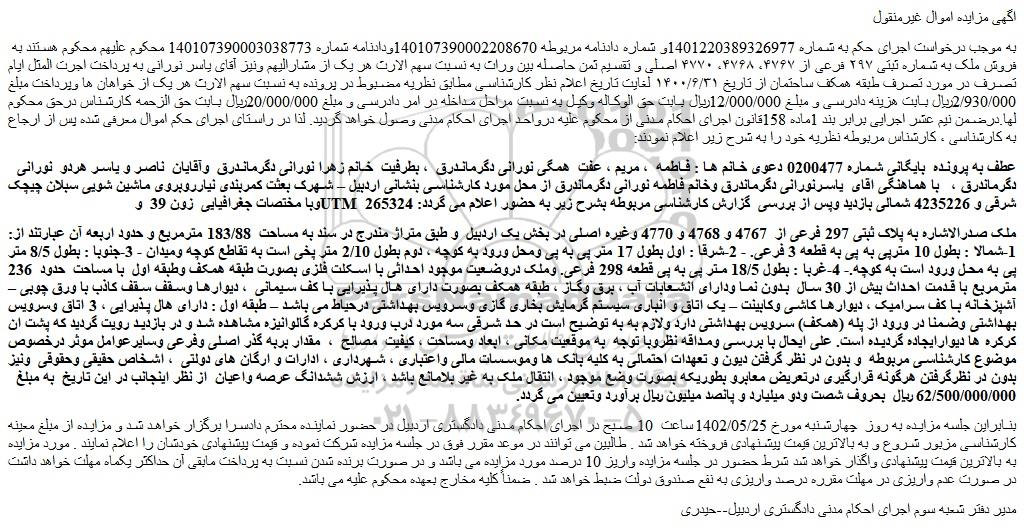 به موجب درخواست اجرای حکم به شماره 1401220389326977و شماره دادنامه مربوطه 140107390002208670ودادنامه شماره 140107390003038773 محکوم علیهم محکوم هستند به فروش ملک به شماره ثبتی ۲۹۷ فرعی از ۴۷۶۷، ۴۷۶۸، ۴۷۷۰ اصلی و تقسیم ثمن حاصله بین وراث به نسبت سهم الارث هر یک از مشارالیهم ونیز آقای یاسر نورانی به پرداخت اجرت المثل ایام تصرف در مورد تصرف طبقه همکف ساحتمان از تاریخ ۱۴۰۰/۶/۳۱ لغایت تاریخ اعلام نظر کارشناسی مطابق نظریه مضبوط در پرونده به نسبت سهم الارث هر یک از خواهان ها وپرداخت مبلغ 2/930/000ریال بابت هزینه دادرسی و مبلغ 12/000/000ریال بابت حق الوکاله وکیل به نسبت مراحل مداخله در امر دادرسی و مبلغ 20/000/000ریال بابت حق الزحمه کارشناس درحق محکوم لها.درضمن نیم عشر اجرایی برابر بند 1ماده 158قانون اجرای احکام مدنی از محکوم علیه درواحد اجرای احکام مدنی وصول خواهد گردید. لذا در راستای اجرای حکم اموال معرفی شده پس از ارجاع به کارشناسی ، کارشناس مربوطه نظریه خود را به شرح زیر اعلام نمودند: