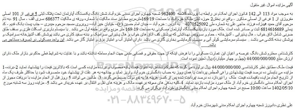 به موجب مواد 113 الی 142 قانون اجرای احکام در رابطه با پرونده کلاسه 962400 شعبه چهارم اجرای مدنی خرم آباد شش دانگ یکدستگاه آپارتمان تحت پلاک ثبتی 5 فرعی از 101 اصلی مفروزی از 1 فرعی از اصلی مذکور ، واقع در بخش2 حوزه ثبتی ملک خرم آباد با مساحت 169/19مترمربع مطابق سند مالکیت با شماره ورقه ی مالکیت 686377 سری الف ، سال 91 ،به نام مرحوم آقای حمید محمدزاده فرزند حاجی علی به شماره ملی 4070525092 به آدرس : خرم آباد – میدان امام حسین (ع)– خیابان خیر آباد– روبروی مسجد مرحوم حیدری – جنب پست بانک قدیم - کد پستی 6814616689 ثبت و صادر شده است .ملک مورد بازدید یکدستگاه آپارتمان مسکونی به مساحت 169،19 متر مربع واقع در طبقه اول می باشد . با سیستم باربری اسکلت فلزی و سقف طاق ضربی شامل اتاق خواب ، هال پذیرایی ، آشپزخانه ، حمام و سرویس بهداشتی که پوشش کف اتاق های خواب و هال پذیرایی سرامیک و بدنه سفید کاری می باشد پوشش کف آشپزخانه سرامیک و پوشش بدنه کاشی می باشد . سیستم سرمایشی کولر آبی و سیستم گرمایشی بخاری گازی می باشد دارای امتیاز آب و امتیاز برق و امتیاز گاز می باشد. این واحد مسکونی در تصرف مستاجر می باشد.