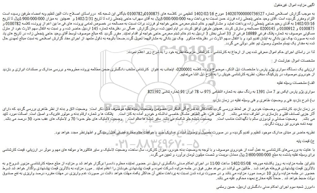 مزایده فروش یک دستگاه سواری پژو پارس, مزایده فروش یک دستگاه سواری پژو پارس