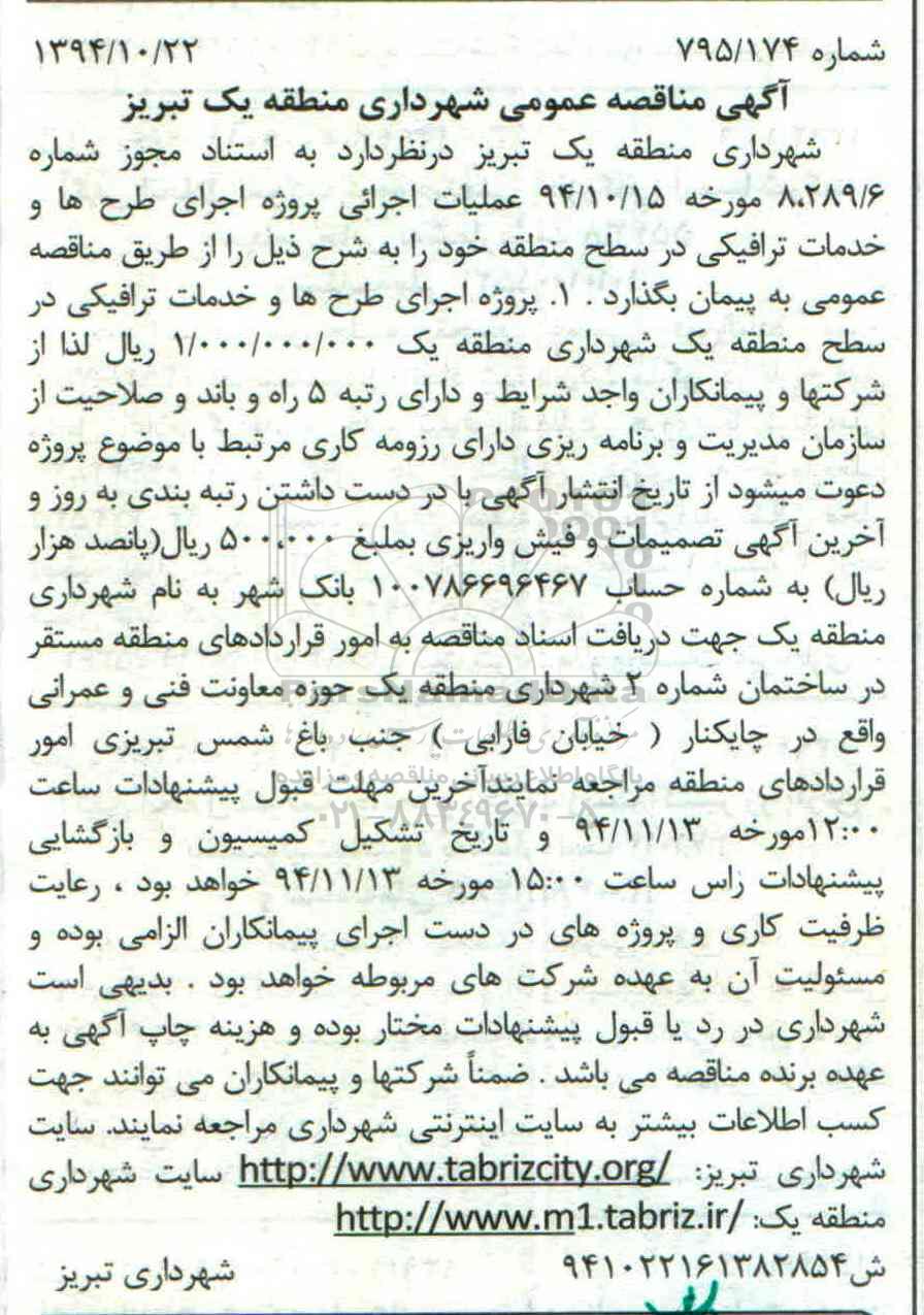 شهرداری منطقه یک تبریز در نظر دارد عملیات اجرایی پروژه اجرای طرح ها و خدمات ترافیکی در سطح منطقه خود را به شرح ذیل را از طریق مناقصه عمومی به پیمان بگذارد
