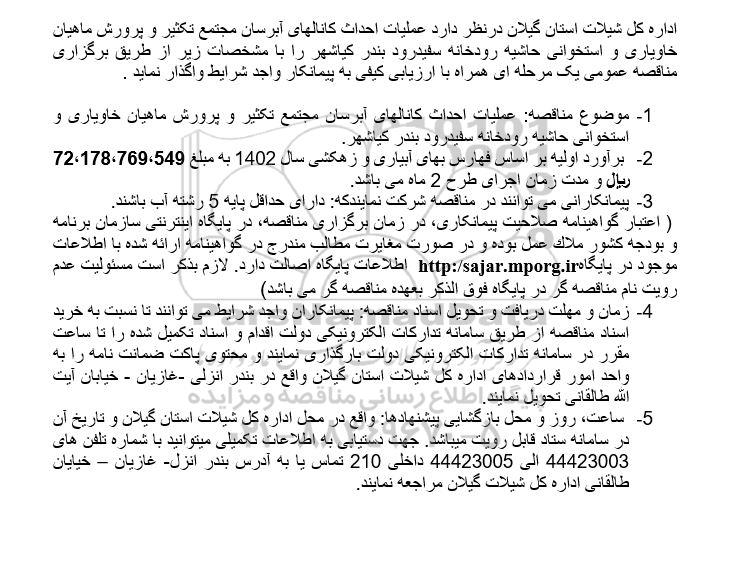 اداره کل شیلات استان گیلان در نظر دارد عملیات احداث کانال های آبرسان مجتمع تکثیر و پرورش ماهیان خاویاری و استخوانی حاشیه رودخانه سفیدرود بندر کیاشهر را با مشخصات زیر از طریق برگزاری مناقصه عمومی یک مرحله ای همراه با ارزیابی کیفی به پیمانکار واجد شرایط واگذار نماید.