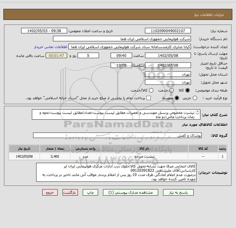 استعلام تیشرت مخصوص پرسنل مهندسی و تعمیرات مطابق لیست پیوست-تعداد:مطابق لیست پیوست-نحوه و زمان پرداخت مالی:دو ماه, استعلام تیشرت مخصوص پرسنل مهندسی و تعمیرات مطابق لیست پیوست-تعداد:مطابق لیست پیوست-نحوه و زمان پرداخت مالی:دو ماه