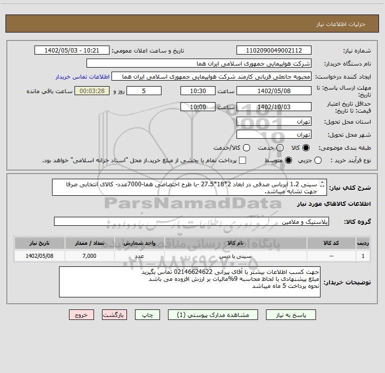 شرح کلی نیاز: سینی 1.2 ایرباس صدفی در ابعاد 2*18*27.5 -با طرح اختصاصی هما-7000عدد- کالای انتخابی صرفا جهت تشابه میباشد.