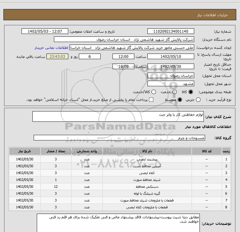 استعلام لوازم حفاظتی کار با واتر جت, استعلام لوازم حفاظتی کار با واتر جت