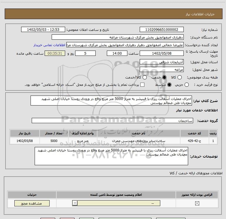 شرح کلی نیاز: اجرای عملیات آسفالت ریزی با فینیشر به متراژ 5000 متر مربع واقع در ورودی روستا خیابان اصلی شهید محمدیان طی ضمائم پیوستی