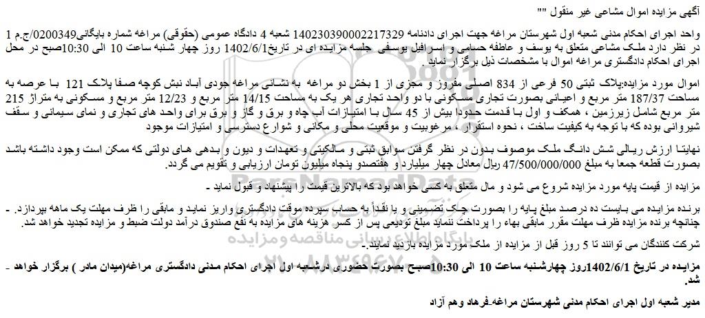 "آگهی مزایده اموال مشاعی غیر منقول "
