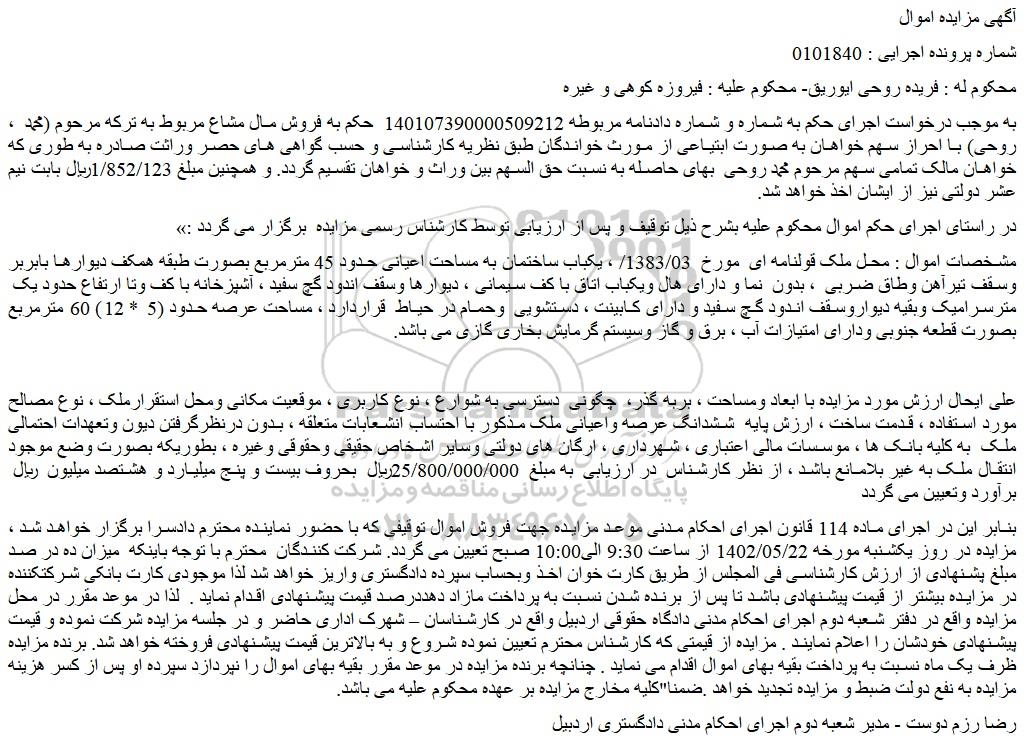 بنابر این در اجرای ماده 114 قانون اجرای احکام مدنی موعد مزایده جهت فروش اموال توقیفی که با حضور نماینده محترم دادسرا برگزار خواهد شد ، مزایده در روز یکشنبه مورخه 1402/05/22 از ساعت 9:30 الی10:00 صبح تعیین می گردد. شرکت کنندگان  محترم با توجه باینکه  میزان ده در صد مبلغ پشنهادی از ارزش کارشناسی فی المجلس از طریق کارت خوان اخذ وبحساب سپرده دادگستری واریز خواهد شد لذا موجودی کارت بانکی شرکتکننده در مزایده بیشتر از قیمت پیشنهادی باشد تا پس از برنده شدن نسبت به پرداخت مازاد دهددرصد قیمت پیشنهادی اقدام نماید .  لذا در موعد مقرر در محل مزایده واقع در دفتر شعبه دوم اجرای احکام مدنی دادگاه حقوقی اردبیل واقع در کارشناسان – شهرک اداری حاضر و در جلسه مزایده شرکت نموده و قیمت پیشنهادی خودشان را اعلام نمایند . مزایده از قیمتی که کارشناس محترم تعیین نموده شروع و به بالاترین قیمت پیشنهادی فروخته خواهد شد. برنده مزایده ظرف یک ماه نسبت به پرداخت بقیه بهای اموال اقدام می نماید . چنانچه برنده مزایده در موعد مقرر بقیه بهای اموال را نپردازد سپرده او پس از کسر هزینه مزایده به نفع دولت ضبط و مزایده تجدید خواهد .ضمنا"کلیه مخارج مزایده بر عهده محکوم علیه می باشد.