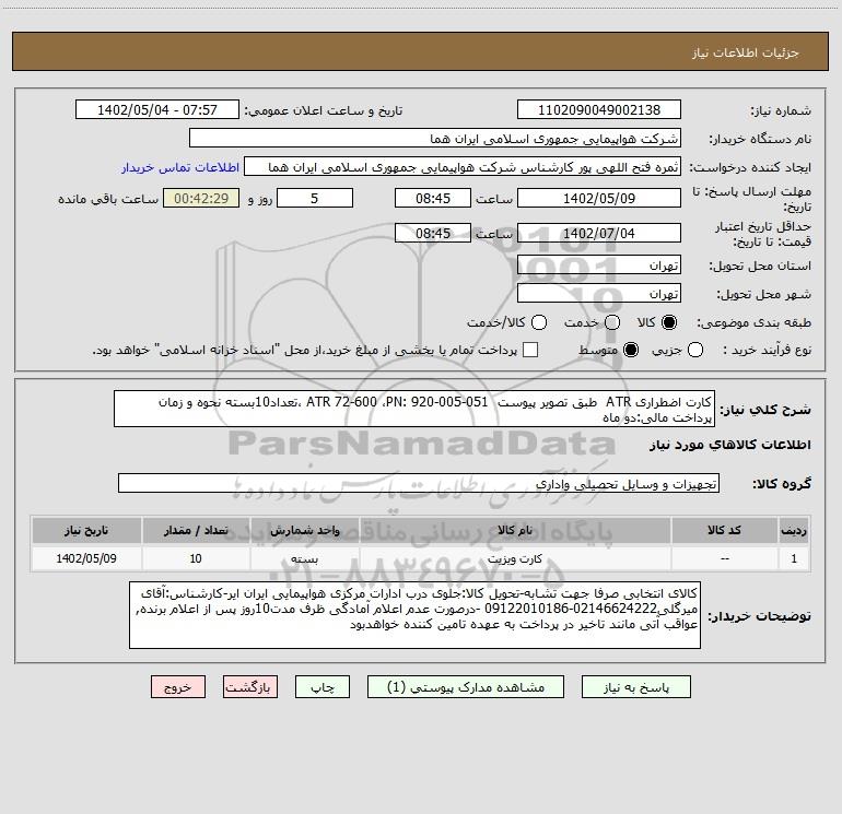 شرح کلی نیاز: کارت اضطراری ATR طبق تصویر پیوست ATR 72-600 ،PN: 920-005-051 ،تعداد10بسته نحوه و زمان پرداخت مالی:دو ماه