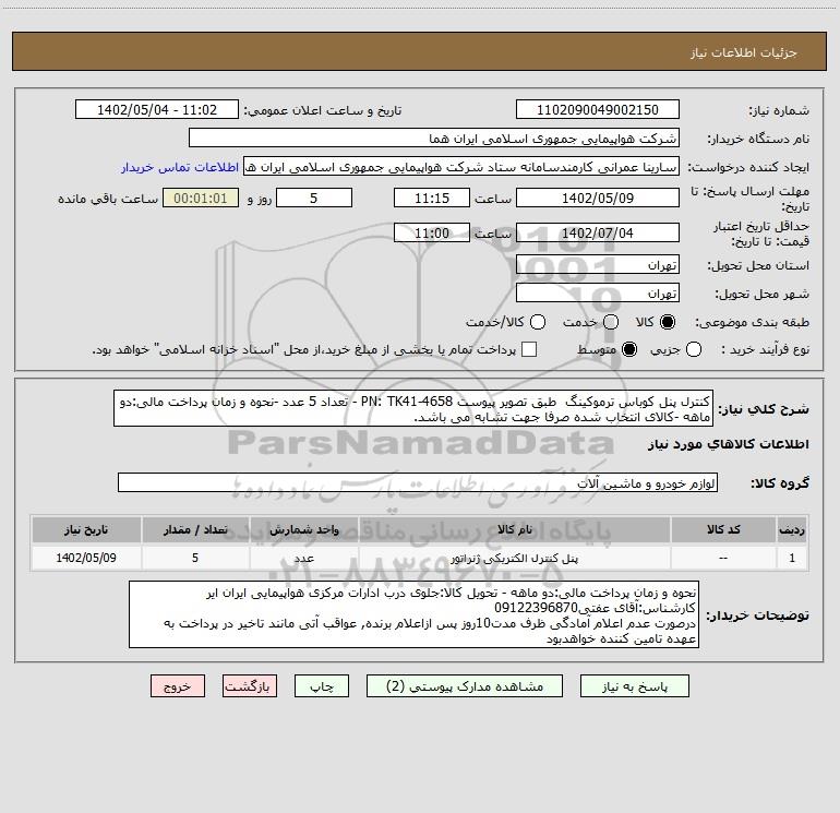 شرح کلی نیاز: کنترل پنل کوباس ترموکینگ طبق تصویر پیوست PN: TK41-4658 - تعداد 5 عدد -نحوه و زمان پرداخت مالی:دو ماهه -کالای انتخاب شده صرفا جهت تشابه می باشد.