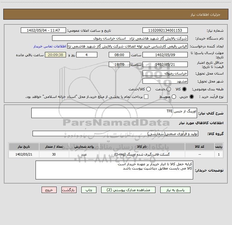 نام دستگاه خریدار:شرکت پالایش گاز شهید هاشمی نژاد استان خراسان رضوی
