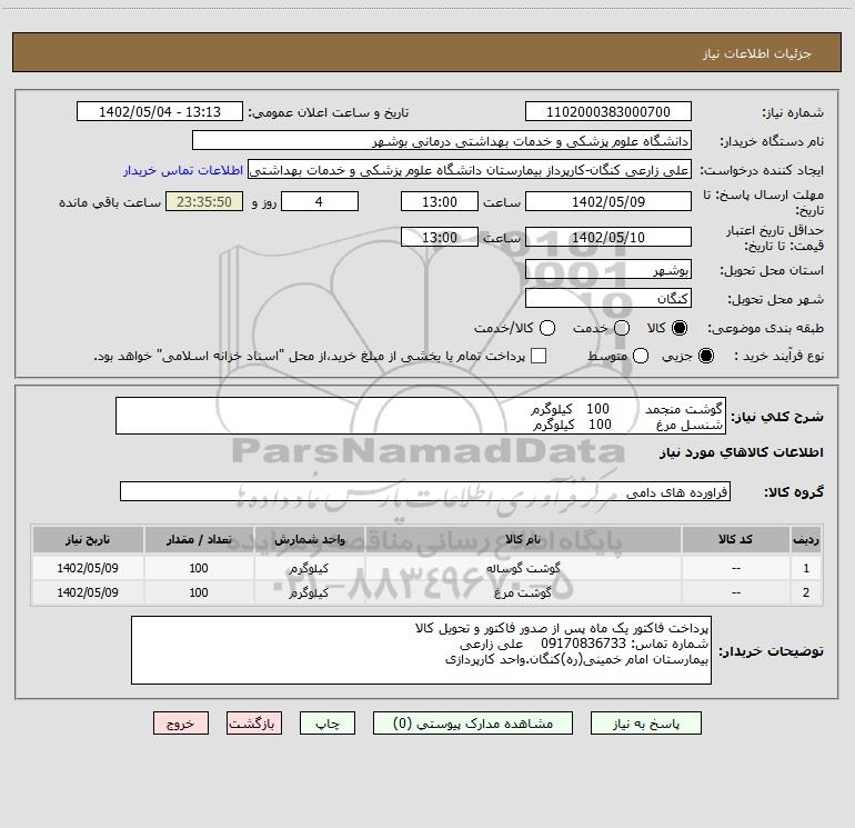 | 2 | -- | گوشت مرغ | کیلوگرم | 100 | 1402/05/09 |