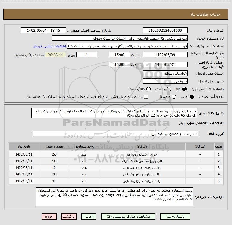 نام دستگاه خریدار:شرکت پالایش گاز شهید هاشمی نژاد استان خراسان رضوی