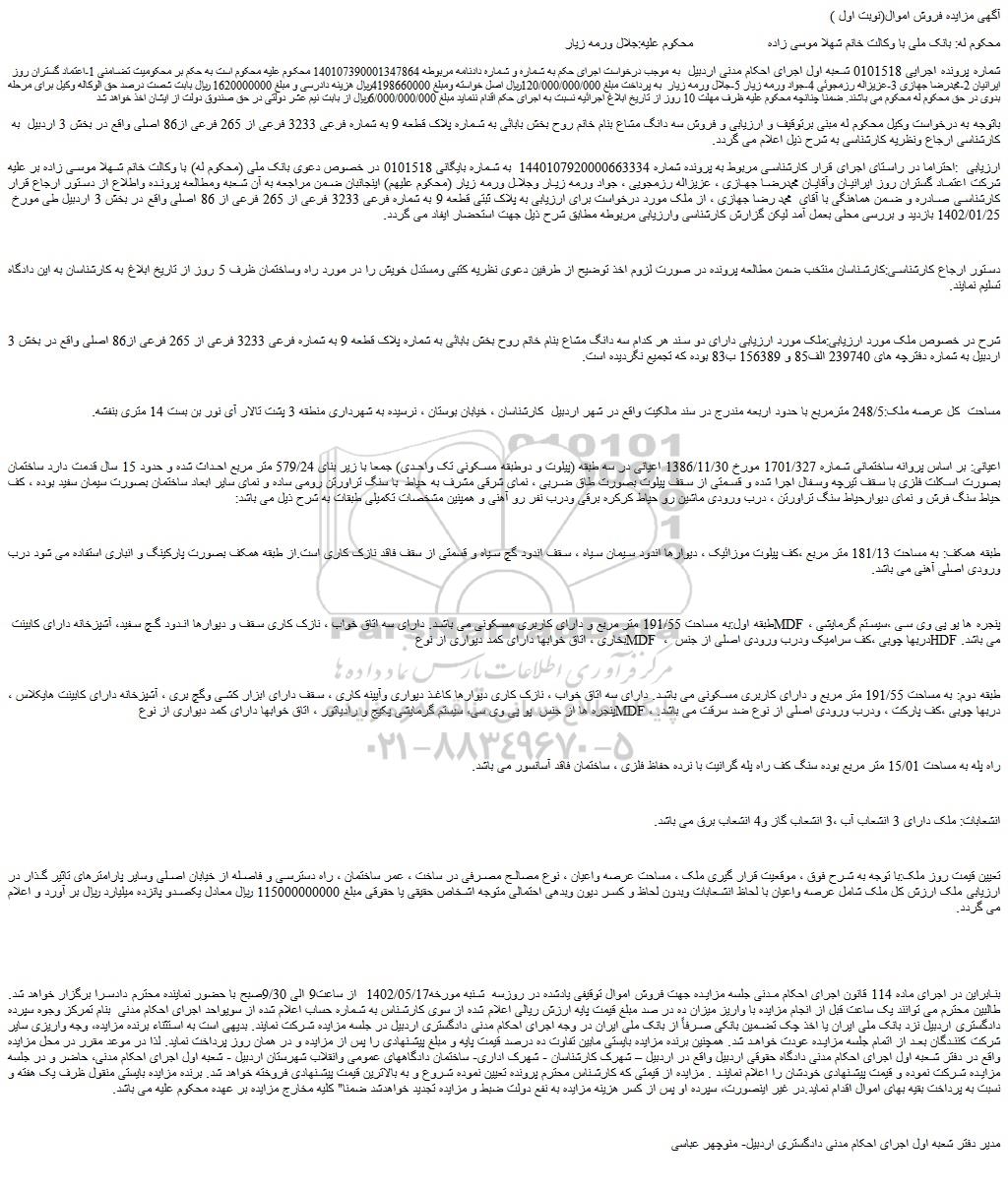 ارزیابی :احتراما در راستای اجرای قرار کارشناسی مربوط به پرونده شماره 1440107920000663334 به شماره بایگانی 0101518 در خصوص دعوی بانک ملی (محکوم له) با وکالت خانم شهلا موسی زاده بر علیه شرکت اعتماد گستران روز ایرانیان وآقایان محمدرضا جهازی ، عزیزاله رزمجویی ، جواد ورمه زیار وجلال ورمه زیار (محکوم علیهم) اینجانبان ضمن مراجعه به آن شعبه ومطالعه پرونده واطلاع از دستور ارجاع قرار کارشناسی صادره و ضمن هماهنگی با آقای محمد رضا جهازی ، از ملک مورد درخواست برای ارزیابی به پلاک ثبتی قطعه 9 به شماره فرعی 3233 فرعی از 265 فرعی از 86 اصلی واقع در بخش 3 اردبیل طی مورخ 1402/01/25 بازدید و بررسی محلی بعمل آمد لیکن گزارش کارشناسی وارزیابی مربوطه مطابق شرح ذیل جهت استحضار ایفاد می گردد.