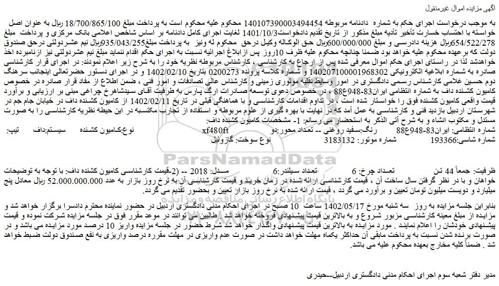 به موجب درخواست اجرای حکم به شماره دادنامه مربوطه 140107390003494454 محکوم علیه محکوم است به پرداخت مبلغ 18/700/865/100 ریال به عنوان اصل خواسته با احتساب خسارت تأخیر تأدیه مبلغ مذکور از تاریخ تقدیم دادخواست1401/10/3 لغایت اجرای کامل دادنامه بر اساس شاخص اعلامی بانک مرکزی و پرداخت مبلغ 654/522/278ریال هزینه دادرسی و مبلغ 600/000/000ریال حق الوکاله وکیل درحق محکوم له ونیز به پرداخت مبلغ935/043/255ریال نیم عشردولتی درحق صندوق دولت که برعهده محکوم علیه خواهد بود ضمنا چنانچه محکوم علیه ظرف 10روز پس ازابلاغ اجرائیه نسبت به اجرای حکم اقدام ننماید مبلغ نیم عشردولتی نیز ازنامبرده اخذ خواهدشد لذا در راستای اجرای حکم اموال معرفی شده پس از ارجاع به کارشناسی ، کارشناس مربوطه نظریه خود را به شرح زیر اعلام نمودند: در اجرای قرار کارشناسی صادره به شماره ابلاغیه الکترونیکی 140207100001968302 و شماره کلاسه پرونده 0200273 بتاریخ 1402/02/10 و در اجرای دستور حضرتعالی اینجانب سرهنگ دوم حسین غلامی کارشناس رسمی دادگستری در امور وسایط نقلیه موتوری زمینی و کارشناس عالی تصادفات و امور فنی ، ضمن اطلاع از مفاد قرار صادره در خصوص کامیون کشنده داف به شماره انتظامی ایران83-948ع88 ، در خصوص دعوی توسعه صادرات ارگ پارس به طرفیت آقای سیدشاهرخ چراغی مبنی بر ارزیابی و برآورد قیمت واقعی کامیون کشنده فوق را خواستار شده است ، در تداوم اقدامات کارشناسی و با هماهنگی قبلی در تاریخ 1402/02/11 از کامیون کشنده داف در خیابان جام جم در شهرستان اردبیل بازدید فنی و کارشناسی به عمل آمد که در نهایت با بهره گیری از علوم مربوطه و استفاده از تجارب مکتسبه در این حیطه نظریه کارشناسی را به صورت مستدل و مکتوب انشاء و به شرح آتی الذکر به استحضار می رسانم: 1- مشخصات کامیون کشنده داف: نوع:کامیون کشنده سیستم:داف تیپ: xf480ft شماره انتظامی: ایران83-948ع88 رنگ:سفید روغنی -- تعداد محور:دو شماره شاسی:193366 شماره موتور: 3183132 نوع سوخت: گازوئیل