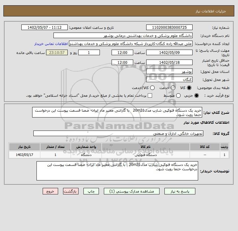 شرح کلی نیاز: خرید یک دستگاه فتوکپی شارپ مدل20m31 با گارانتی معتبر ماد ایران- ضمنا قسمت پیوست این درخواست حتما رویت شود.