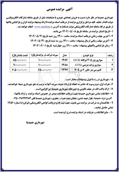 شهرداری حمیدیا در نظر دارد نسبت به فروش تعدادی خودرو با مشخصات ذیل از طریق سامانه تدارکات الکترونیکی دولت اقدام نمانید. کلیه مراحل برگزاری مزایده از دریافت اسناد مزایده تا ارائه پیشنهاد مزایده گران و بازگشایی پاکتها از طریق درگاه سامانه تدارکات الکترونیکی دولت ستاد به ادرس سایت ستاد انجام خواهد شد.
